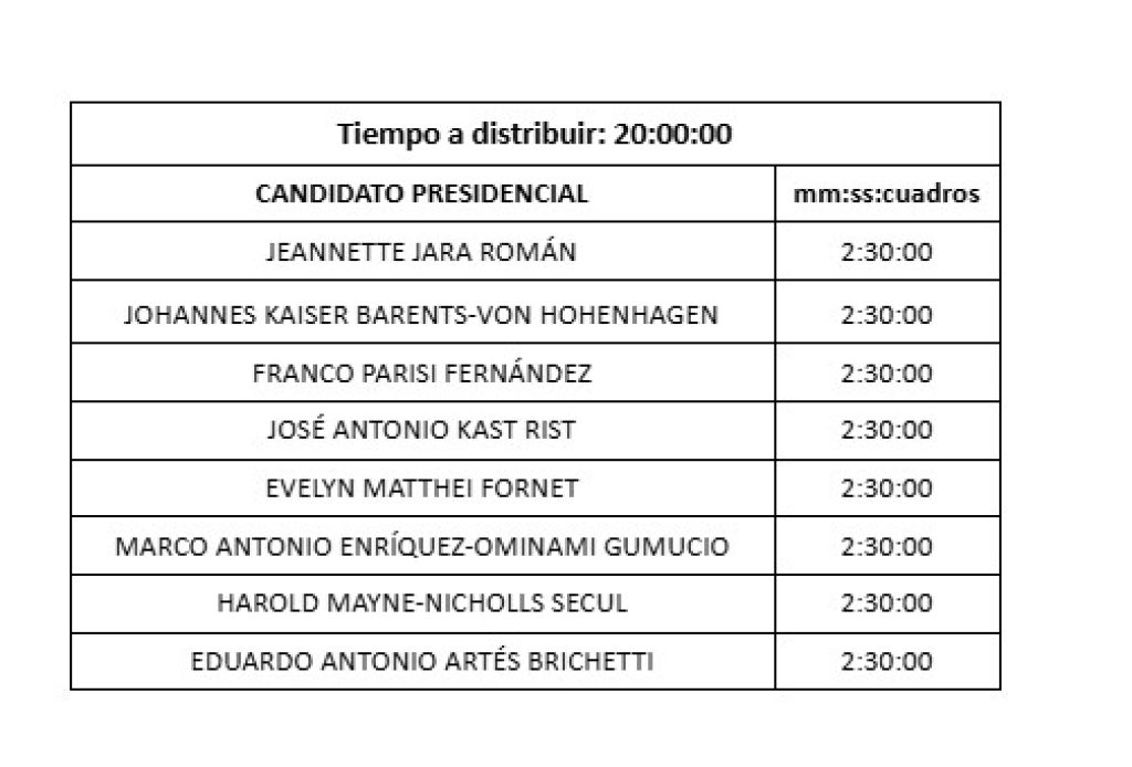 En el caso de la elección presidencial, el tiempo se distribuirá en partes iguales entre todas las candidaturas, correspondiendo 2 minutos con 30 segundos por candidato.