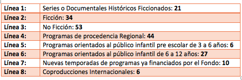48 proyectos corresponden al Fondo de Proyectos Audiovisuales de Interés Comunitario, 53 a no ficción y 44 en la línea regional.