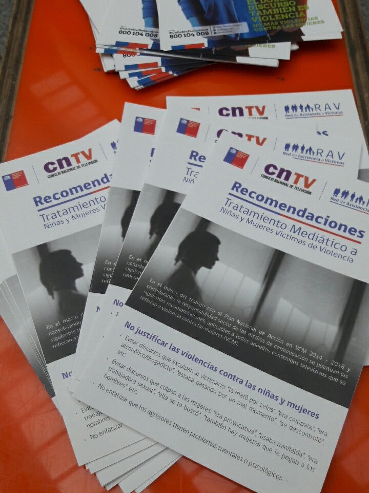 Este año el CNTV junto al Ministerio de la Mujer y Equidad de Género, la Red de Atención a Víctimas del Ministerio del Interior y representantes de canales de televisión abierta, firmaron un convenio para que se mostrara en pantalla el número 800-104 -008 para la difusión de información sobre casos de femicidio o femicidio frustrado.