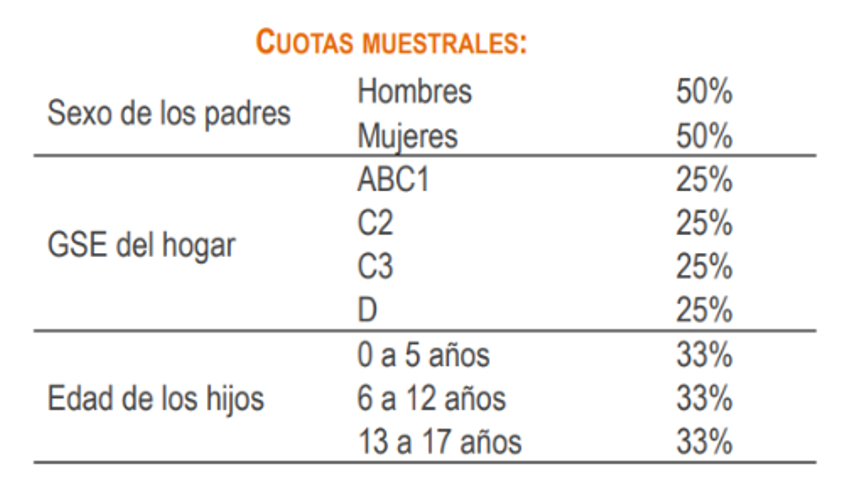 La metodología de la encuesta utilizó una muestra no probabilística de 806 casos, extraída del panel en línea de Netquest. «Es una muestra por cuotas, formada por padres y madres, mayores de 18 años, con hijos e hijas de hasta 17 años, de todas las regiones de Chile», sostiene el estudio.