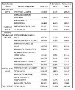 La distribución de los tiempos se realizará según el cuadro presentado a continuación, el que establece el tiempo total diario de cada participante. Dicho tiempo diario, deberá ser dividido en partes iguales para las dos emisiones diarias en televisión, una a las 12:45 y otra, a las 20:45.
