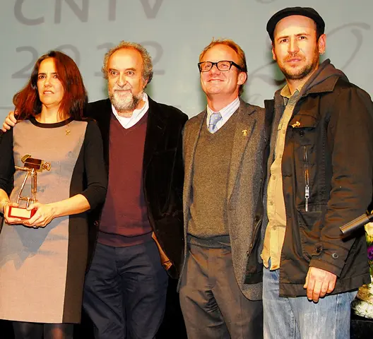 Carmen Gloria López y Rony Goldschied, ficción TVN; Mauro Valdés, director ejecutivo TVN; y Nicolás Acuña, director, reciben el Fondo CNTV 2012 en categoría Co-Producción Internacional con «Sitiados».