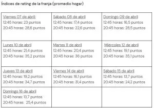 En el horario prime, como es esperable, la cifra es más alta: la franja llegó a cifras de alcance por sobre el millón de personas prácticamente todos los días, con un peak de más de un millón y medio el día lunes 10 de abril.